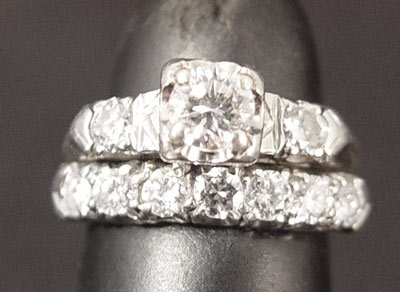 DIAMOND WEDDING RING SET WITH BAND CA. 1950'S: The 14K yellow gold ring is set with 3 diamonds. The center stone is .44 ct approx. rated VSI, color H. The 2 side diamonds and the 7 diamonds in the band are approx. 1.ctw, VSI clarity, G-H color. All stones are round brilliant cut, prong and fish tail prong set. The band and ring are soldered. 6.5 grams. Sold with a GIA appraisal by Florida Diamond Appraisers.