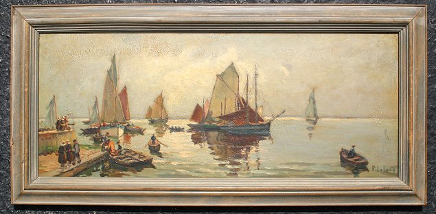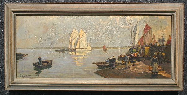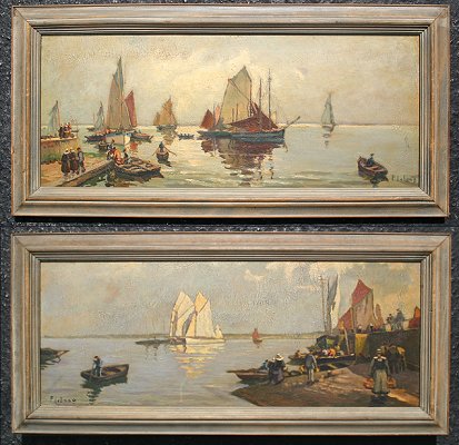 LELONG, Pierre Emile, (French, 1908-1984): Pair of Busy Harbor Scenes, Oil/Masonite, 10 1/2'' x 25 1/2'', signed, framed, 14'' x 29''. Heavy cracklure throughout with some missing paint, needs cleaning and restoration. Sold as is.