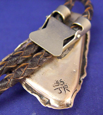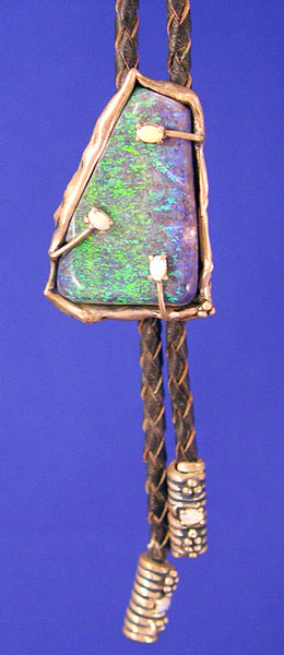 STERLING BLUE/GREEN OPAL WITH 3 SMALL OPALS SIGNED JR BOLO TIE: Triangular shaped large deep blue and green opal main stone with 3 smaller white jelly opals on sterling back. Signed SS JR. Measures 2'' high overall. Cylinder tips also have a small white jelly opal on each.