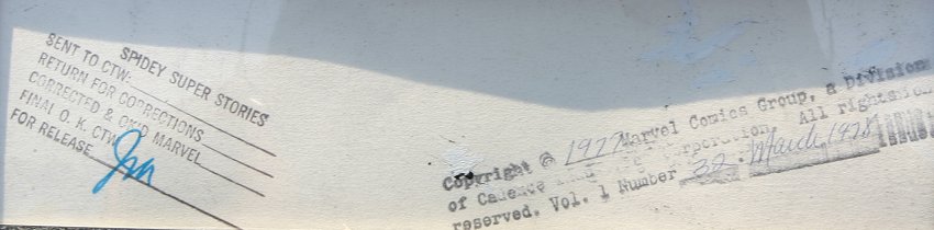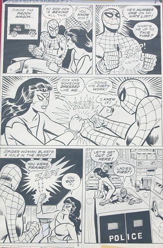 SPIDERMAN ILLUSTRATION, ''SPIDEY SUPER STORIES #32'': Sight size 15 1/2'' x 9 3/4'', framed, 25'' x 20''.