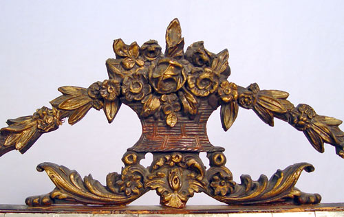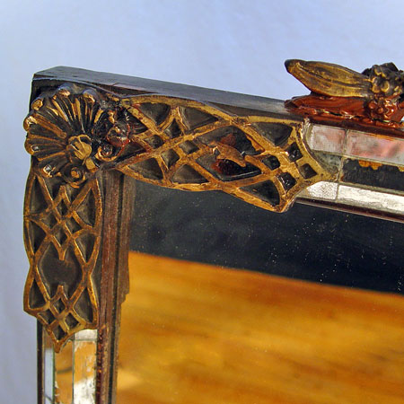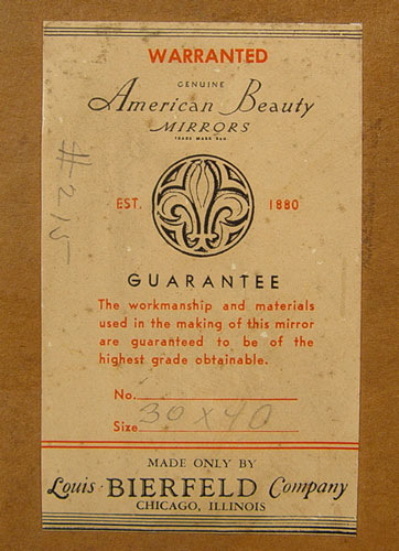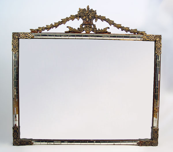 LOUIS BIERFELD OF CHICAGO FRENCH STYLE MIRROR: Framed in mirror tiles, crested with gesso urn and floral swag. 41 1/2'' x 42'' overall, the looking glass is 30 x 40.