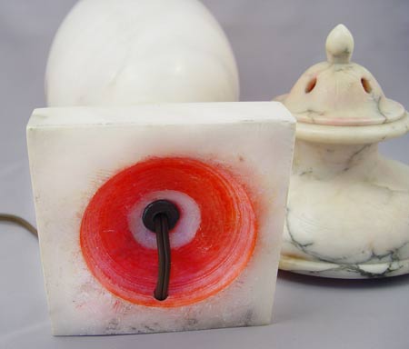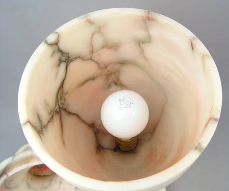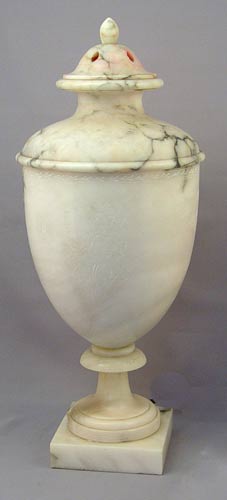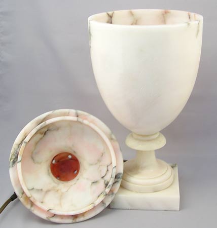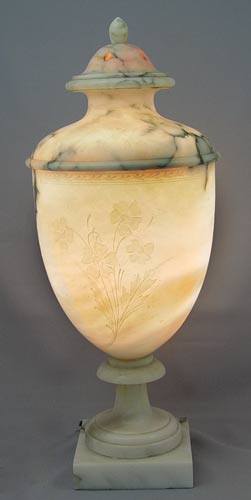 EARLY 20TH CENTURY PINK ALABASTER URN LAMP: Incised carved decoration. 20 3/4'' dia. 5 1/4'' square base