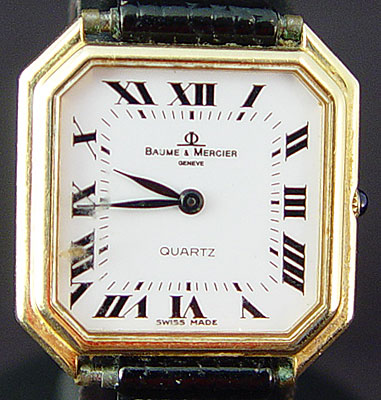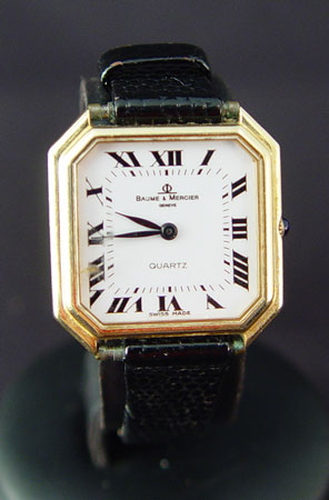 18K LADY'S BAUM & MERCIER WRISTWATCH: 18K yellow gold lady's Baum & Mercier wristwatch. White octagon dial with black enamel Roman markers. Quartz movement. Leather Strap.