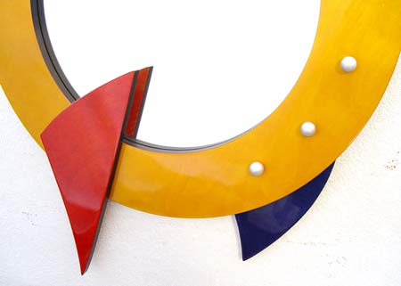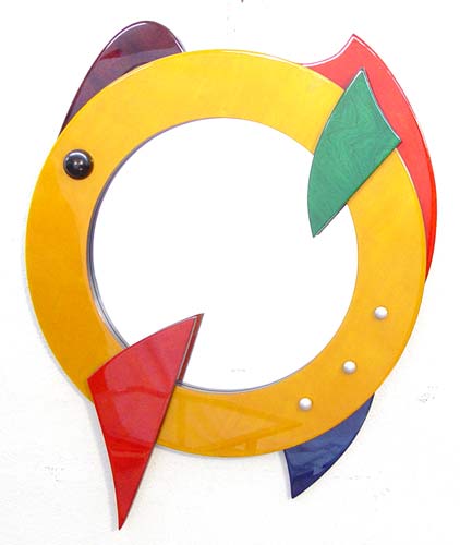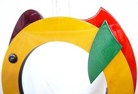 SOUTH BEACH STYLE WALL MIRROR: Round 22'' dia. mirror in a multi colored wood abstract frame, approx. 39'' x 33'' overall.