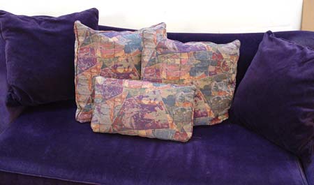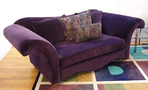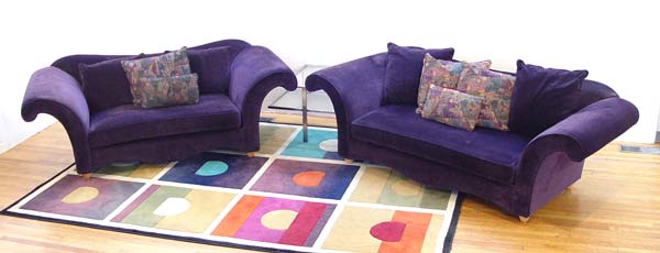 ''WAVE'' SOFA & LOVESEAT BY CARTER: Jobie Redmond, Jr. design, upholstered in swirl patterned deep purple velvet, single cushion seat with multi pillow backs in matched and complimentary upholstery, flared arms and fluted wooden feet in a natural finish. Normal use wear and spotting, they would benefit from a professional cleaning. Sofa measures 33 1/2''h. x 98''l. x 42''d. with the seat being approx. 23''d. to the pillows and 18''h. Loveseat measures 33 1/2''h. x 91''l. x 42''d. with the seat being approx. 23''d. to the pillows and 18''h.