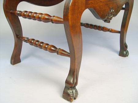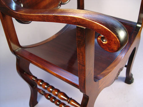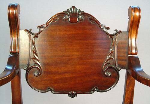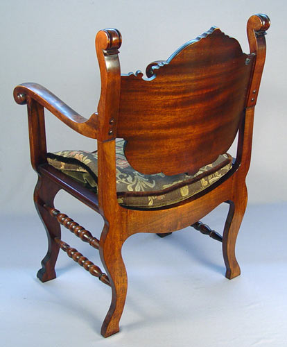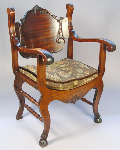 VICTORIAN MAHOGANY SAVRANOLA CHAIR: Open arm chair with curved back and seat, scrolled hand holds, carved top rail. 38'' high x 24'' wide x 21'' deep