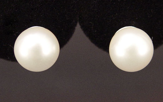 WHITE PEARL STUDS EARRINGS: Lustery white 8.9 mm pearls in 14K white gold stud mounts.
