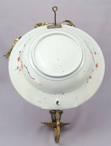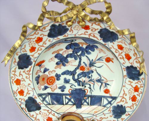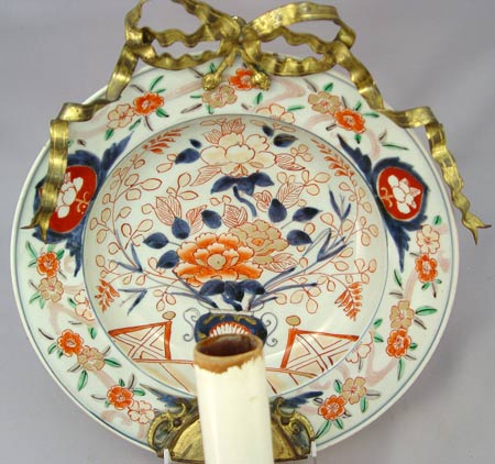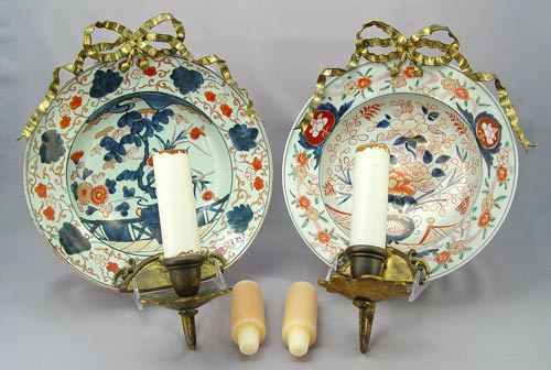 PAIR IMARI DECORATED SCONCES: Converted from 19th C bowls. Electrified at one time, now for candles. 10 1/2'' dia.