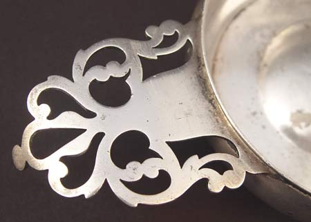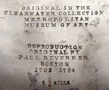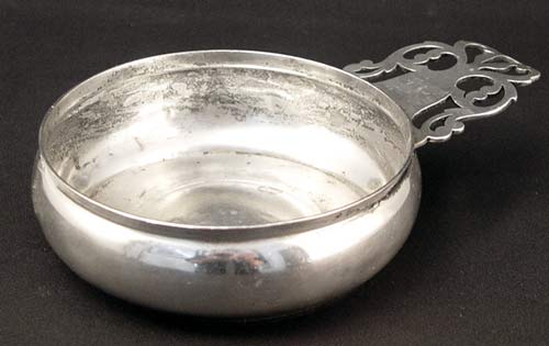 TIFFANY & CO. STERLING PAUL REVERE PORRIDGER: Reproduction by Tiffany & Co. of 18th C. Paul Revere Sr. of Boston. Reticulated handle. Marked on bottom ''Tiffany & Co. 19206 7246 Makers Sterling Silver 925-1000''. ''Original in the Clearwater Collection Metropolitan Museum of Art. Reproduction Original by Paul Revere Sr. Boston 1702 1754. 3 3/4 Gills.''. Measures 1 5/8'' tall x 5'' dia. x 7 1/2'' wide at handle. Approx. 7.95 troy oz.