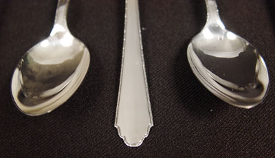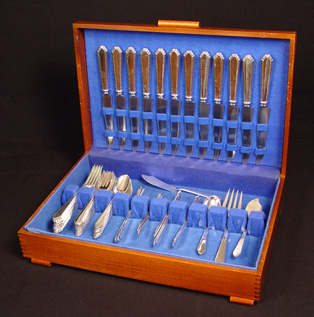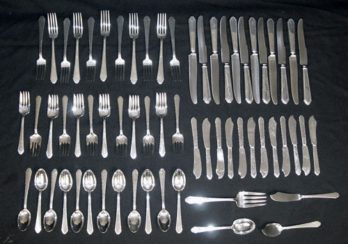 LUNT ''TREASURE'' STERLING FLATWARE: 64 piece service for 12 in Rogers, Lunt & Bowlen Treasure pattern pieces to include: 12 dinner knives (9''), 12 dinner forks (7 1/8''), 12 salad forks (6''), 12 teaspoons (6 7/8''), 12 butter knives (5 7/8''), Master butter knife (7''), sugar spoon (5 1/2''), serving fork (7 1/2''), jelly server (5 7/8''). No monograms. Approx. 59 troy oz.