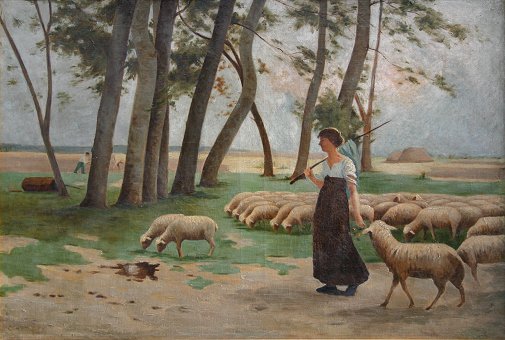 LATE 19TH EARLY 20TH C O/C PAINTING OF SHEPHERDESS SIGNED DE LEFTWICH DODGE: Oil/Canvas, 21 1/2'' x 32'', signed, inscribed Paris, later frame, 26'' x 36''. Painting has been re-stretched, shows some wear, needs cleaning.