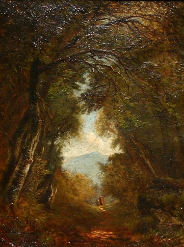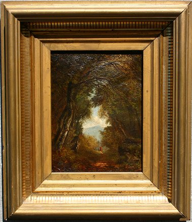 WALTERS, M. Josephine, (American, - d.1883): Landscape with figures, OIL/Canvas, 8'' x 6'', signed, period gilded frame with minor wear, 14'' x 12'', faint pencil script signature verso M. Josephine Walters. Cracklure, minor paint flake in lower margin below the frame.