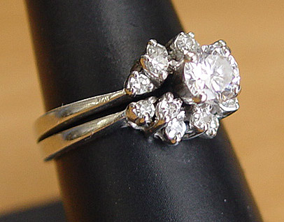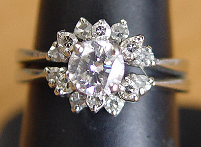 14k WHITE GOLD AND DIAMOND RING: Cantering an approx. 1/2 ct. diamond, 5.1 mm. Surrounded by 14 smaller diamonds. Unusual split 14K white gold setting. Size 6.75 Approx. 5.1 grams.