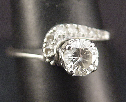 ART DECO DIAMOND RING: Deco style 14K white gold ring with approx. .7 ct round brilliant diamond, 5.4 x 3.2 mm. Smaller diamonds swirl as an accent along the side. Size 6.75. Approx. 24 gr.