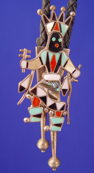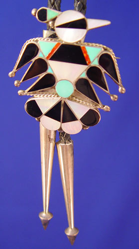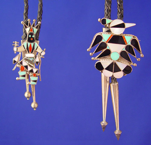 PAIR ZUNI INDIAN THUNDERBIRD BOLO TIES: 1) Signed L Laiwake Zuni NM dancer or warrior with turquoise, mother of pearl, coral and other shell/rock, 2 3/4'' in length. Saucer tips. 2) Thunderbird with turquoise, mother of pearl, other stones. Unsigned but has old sticker with name D. Grimes. 2'' in length. Bullet end tips.