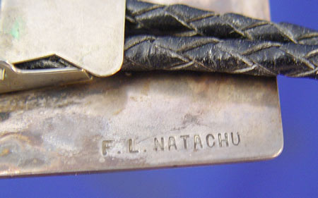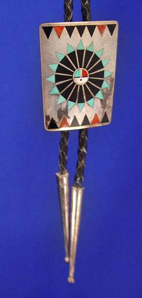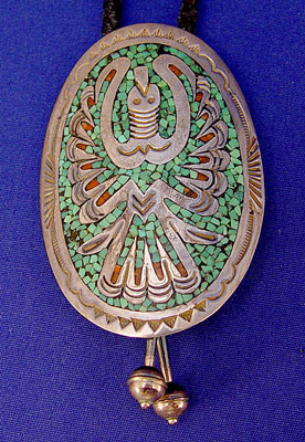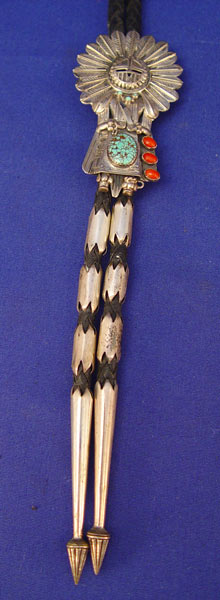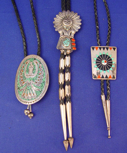 3 SOUTHWEST INDIAN DESIGN STERLING TURQUOISE BOLO TIES: To include 1) Indian in ceremonial headdress and outfit with Turquoise and coral. Signed Sterling Thomas Byrd, Red Mesa, 3'' high. Bullet tips. 2) Inlaid jet, coral and turquoise geometric sun design. Sterling, signed F. L. Natachu, 2'' high. Saucer tips. 3) Inlaid turquoise and coral Thunderbird design. Marked on clasp X over Sterling, 3'' high. Saucer tips.