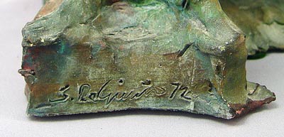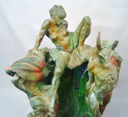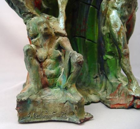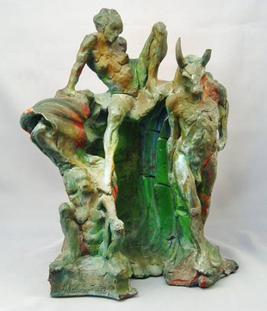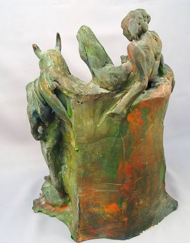 NUDES MINOTAUR POTTERY SCULPTURE: 13 3/4'' tall, illegibly signed S. Deg'' dated '72. Several small chips.