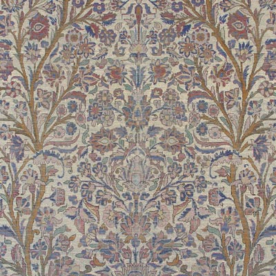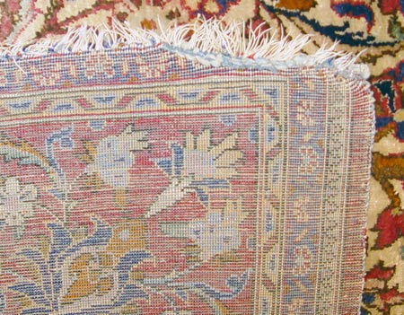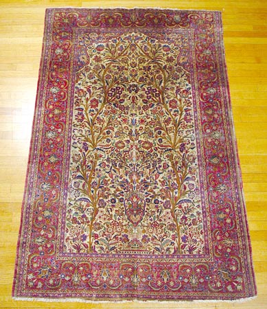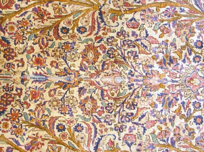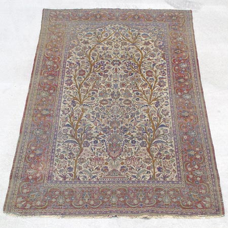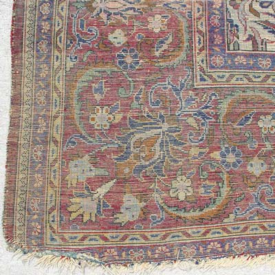 FINE ISFAHAN SILK SAROUK CARPET: Very tight weave in jewel tones. Approx. 6' 7 1/2'' X 4' 2''. Frayed edges, shows wear.