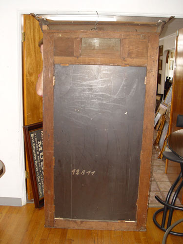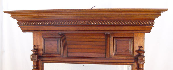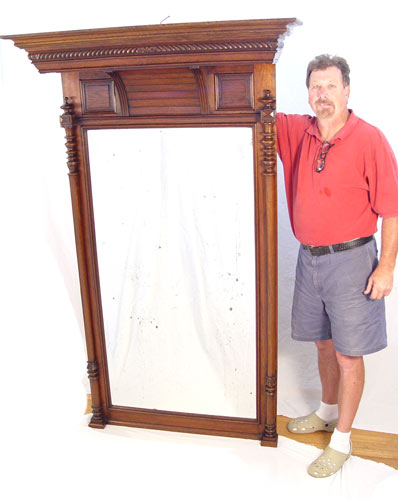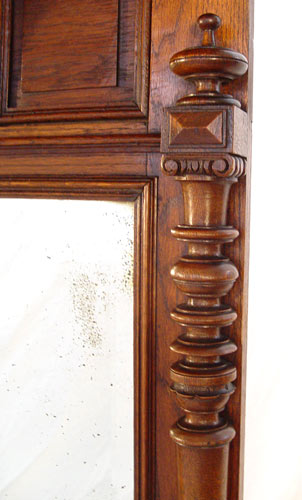 TURN OF THE CENTURY OAK PIER MIRROR: Overhanging top crest, columnar stiles, original beveled looking glass with some silver loss. 6.5' tall x 39'' wide.