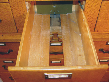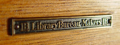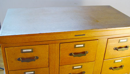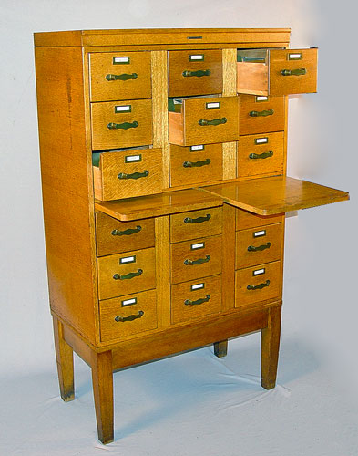 GOLDEN OAK CARD FILE CABINET BY LIBRARY BUREAU MAKERS: 18 drawers hold cards or anything 3.5 x 8''. The case is 58''h. x 33'' x17''. The consignor purchased it from Harvard University.