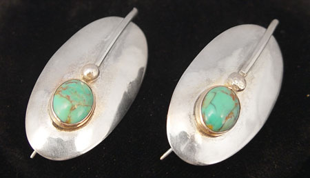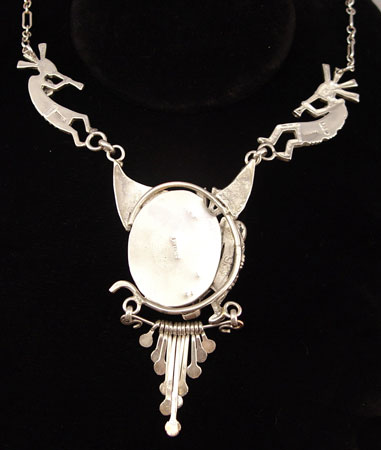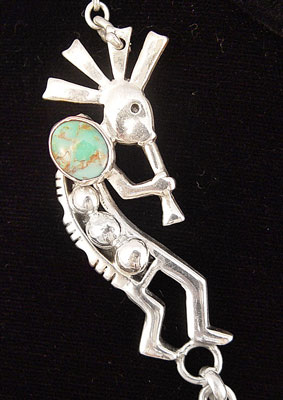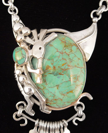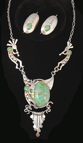 SOUTHWEST KOKAPELLI TURQUOISE & SILVER NECKLACE & EARRINGS: Large cabochon turquoise, 3 Kokepelli figures. Signed IJS. Pendant is 1 3/4'', figures are 2 1/4''. Earrings are 1 3/4'' long.