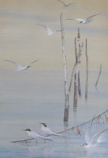 BRIDGES, Fidelia, ANA, (American, 1834-1924): Swallows by the Sea, Watercolor heightened with white, sight size 13 1/2'' x 9 1/4'', signed, dated 1884, later frame, 20 1/2'' x 16 1/2''.