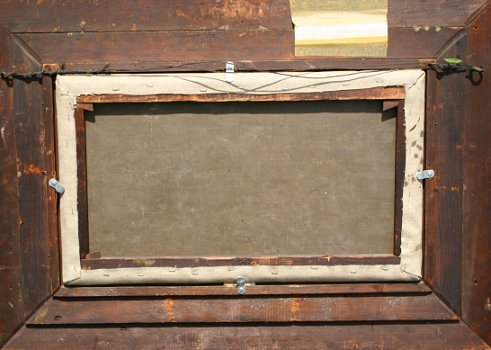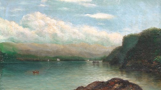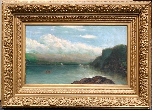 19th C AMERICAN SCHOOL LAKE SIDE LANDSCAPE: Oil/C, 14'' x 24'', no visible signature, encased in period gilt frame, 25'' x 35''. An old label affixed verso reads ''Back of Painting Hudson Scene H Bogart'', implying that this was written on back of canvas before this painting was relined.