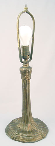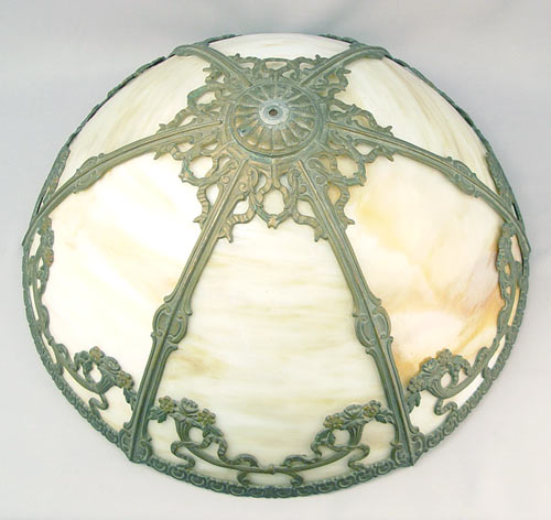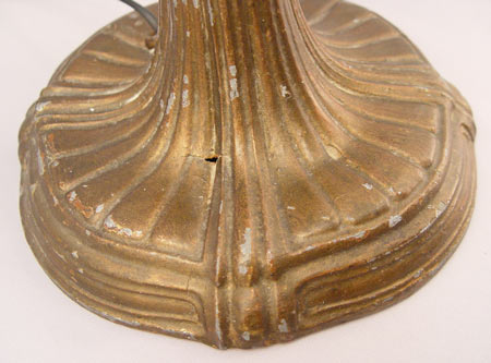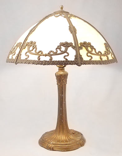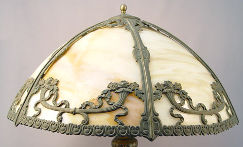 VINTAGE SLAG GLASS TABLE LAMP: Metal overlay, caramel slag. 6 panel domed shade, 17'' dia. Worn finish and separations on base. The lamp is 22''h. overall.
