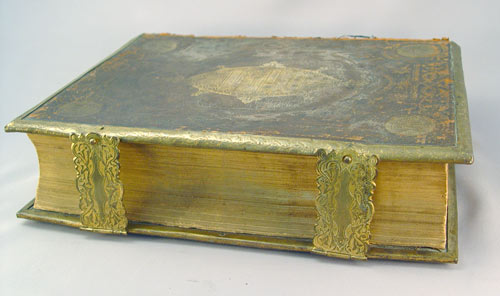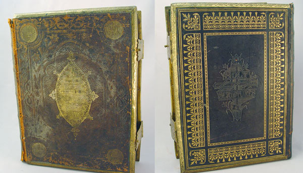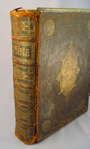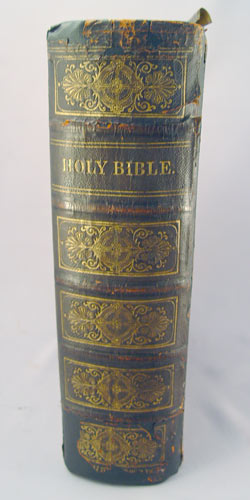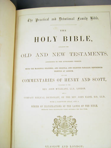 PAIR 19TH CENTURY BIBLES JOHN BROWN, SCOTLAND: Pair of 19th century bibles to include 1) Brown's Self-interpreting Family Bible with the Life of John Brown and detailed introduction. Numerous Colored plates and illustration. Complete book. Cardiff J.E. Shaw, 15 Park Street. Brass edging and clasps. Measures 13 3/8'' x 11'' x 3 1/2''. 2) Williams, Collins, Sons & Co. Glascow, London % Edinburgh, with commentaries by Henry & Scott and numerous illustrations and plates. Complete Brass edging is loose and brass clasps. Measures 13 1/2'' x 10 3/4'' x 3 1/2''. Note condition of binding and cover.