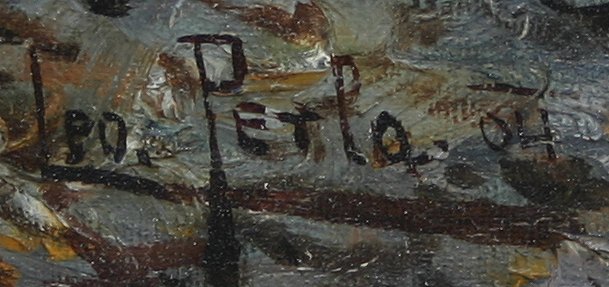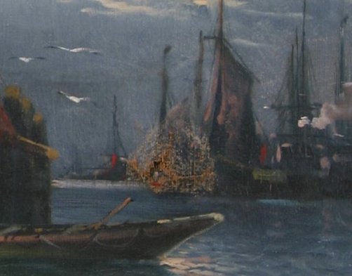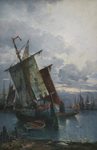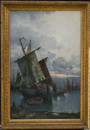 PERLA, Leo, (Kaufmann, Karl L.), (German, 19th C): Harbor Scene, Oil/Canvas, 29'' x 18 3/4'', signed and dated 04, illegibly titled on label verso, period gilded gesso frame with over-paint, 32'' x 22''. Patches visible verso with additional hole.