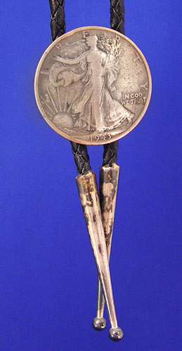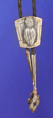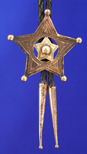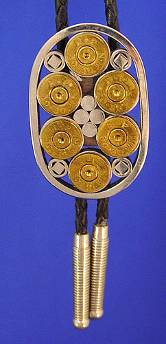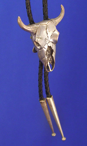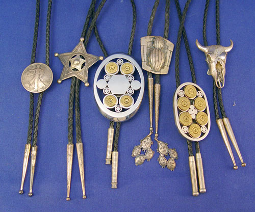 6 PIECE SILVER SOUTHWEST DESIGN BOLO TIES: To include 1) Kit Carson barrel cactus design. Marked Kit Carson Sterling, 1 1/2'' high. point tips with cactus bangles. 2) Sheriff badge design. Marked Kit Carson Sterling. 2'' high, point tips 3) 1943 Silver half dollar attached to clasp. Point tips. 4) Sterling cow skull. Marked TC Sterling, 2 1/8'' high. Point tips. 5) 4 Winchester bullet design in oval. Unmarked as to maker, 2 3/4'' high. Point tips 6) 6 Winchester bullet design in oval. Unmarked as to maker, similar to previous one. 2 1/8'' high. Point tips.