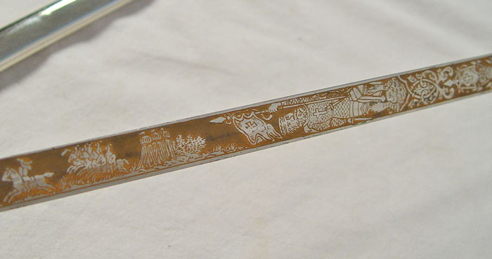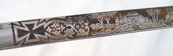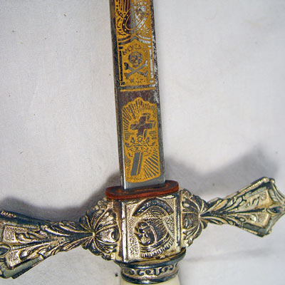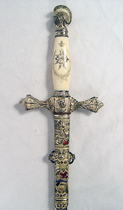 MC LILLEY ORNATE MASONIC SWORD WITH LEATHER CASE: Ornate with knighthead pommel, ivory appearance grip with Masonic decoration and owners initials. Grip is nice and tight. Blade measures 28 3/4'' in length with Masonic gold wash decoration and owners name. Bright blade with a few minor age stain spots. Scabbard is excellent with ornate mounts. Comes with original leather carrying case, also with owner name. Minor split to stitching on one side on top.