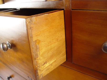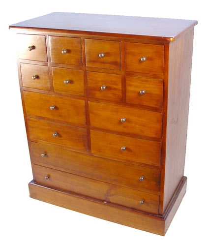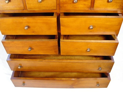 APOTHECARY STYLE CHEST OF DRAWERS: 14 drawers, chamfered drawer bottoms, paneled back, large dovetail construction. 43 1/2'' x 35'' x 17 1/2''.