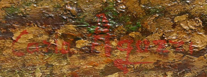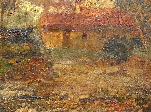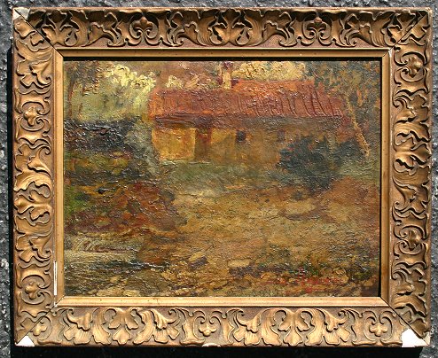 AGAZZI, Carlo (Italian, 1870-1922): Landscape with Cottage, Oil/Wood Panel, 10'' x 12 1/2'', signed, worn gesso frame with missing gesso, 14'' x 17''.