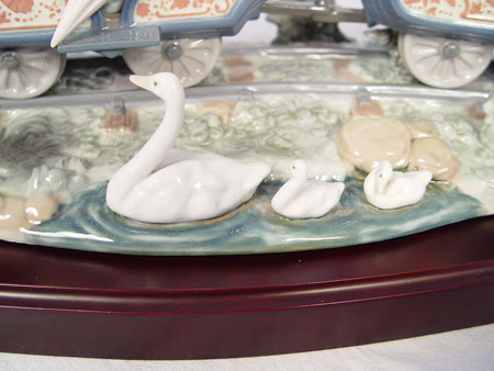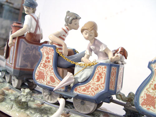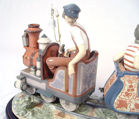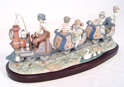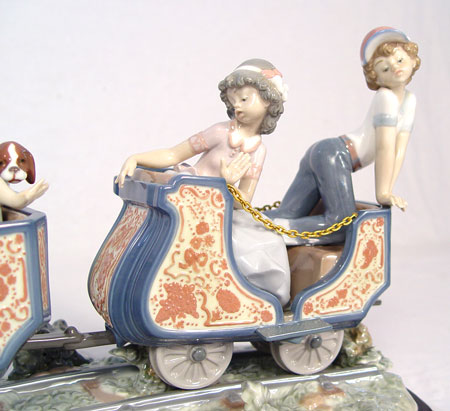 LARGE LLADRO PORCELAIN FIGURAL GROUP ''CIRCUS TRAIN'' 1517: Elaborately done with 2 train cars with boys, girls and puppies, pulled by open engine and conductor. Issued in 1987, retired in 1994. Last retailed for $4350. Glazed finish, 11''h. x 26'' long. We have just been informed the boy in the back has been professionally reattached and is undetectable.