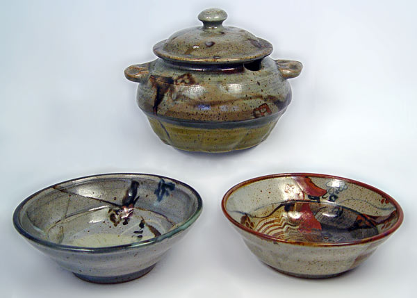 2 JOHN GLICK PLUM TREE POTTERY BOWLS AND COVERED TUREEN: The tureen is 6 1/2''h, by approx. 9'' dia., the bowls are each approx. 3'' h, 8'' dia. John Glick, proprietor of Plum Tree Pottery, Farmington Hills, Michigan since 1964.