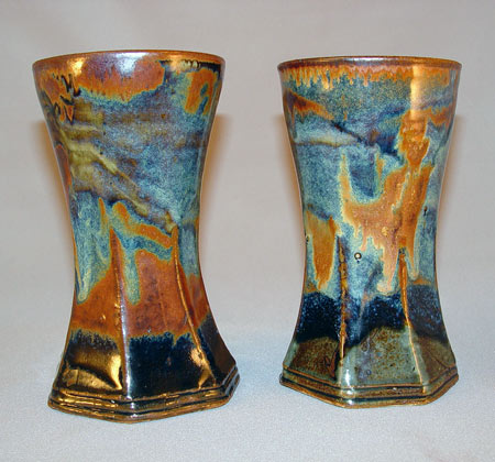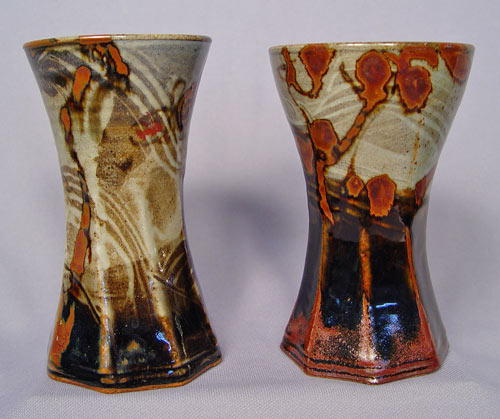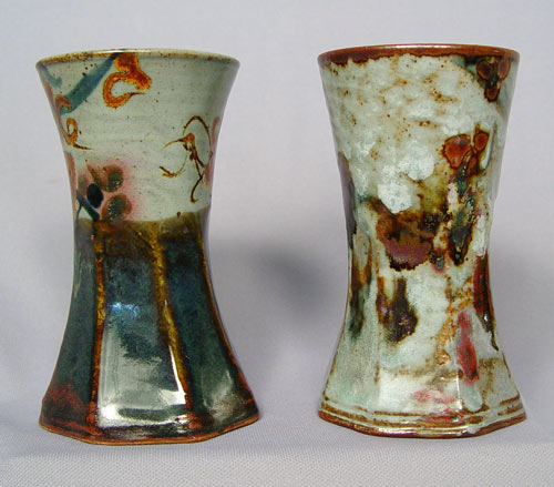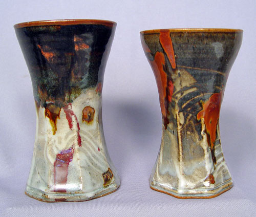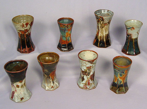8 JOHN GLICK PLUM TREE POTTERY TUMBLERS: 5 3/4'' - 6 1/2'' tall, each hand crafted and unique. John Glick, proprietor of Plum Tree Pottery, Farmington Hills, Michigan since 1964.