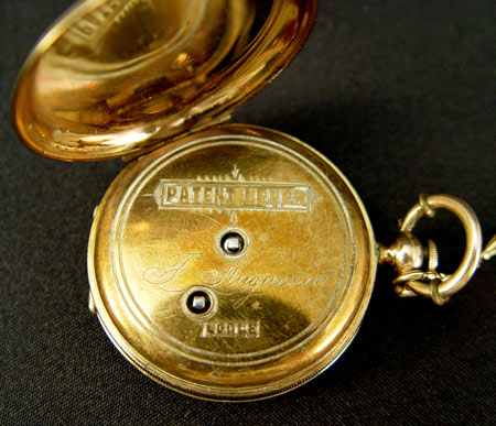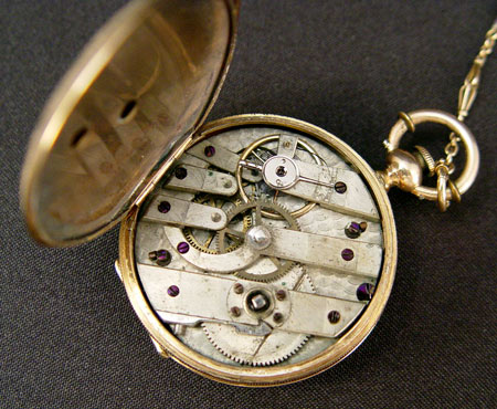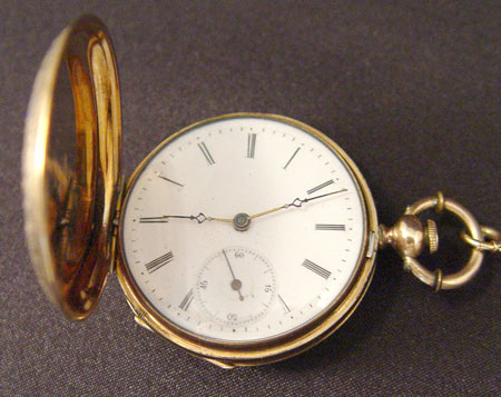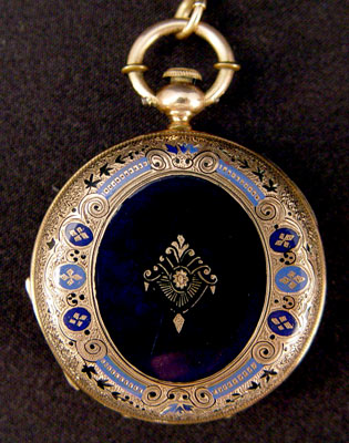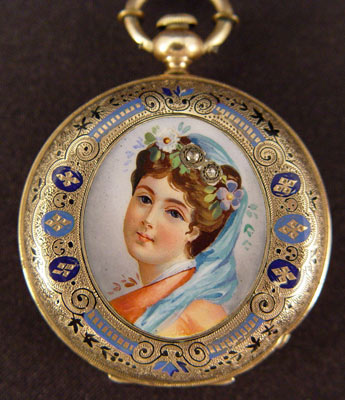 HUGUENIN DIAMOND AND ENAMEL KEY WIND POCKET WATCH AND CHAIN: 14k gold case with enamel decoration and portrait. Key wind, key included. Not in working order, possibly need only a cleaning as no parts appear broken. Watch is 1 /12'' dia. overall. Please note dent to case. Size 6. 14K gold chain with enamel links. Later gold filled clasp. In original wood presentation box.