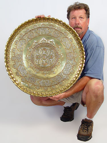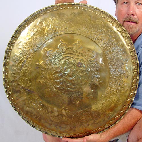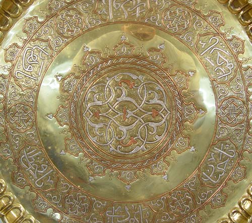 ROUND SILVER INLAID PERSIAN BRASS TRAY: Brass with mixed metal inlay in embossed design with Arabic script and geometric designs. Measures 25 3/4'' in diameter.