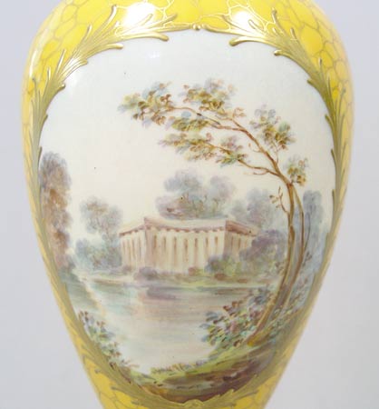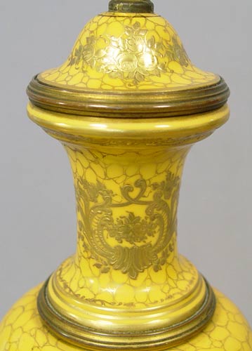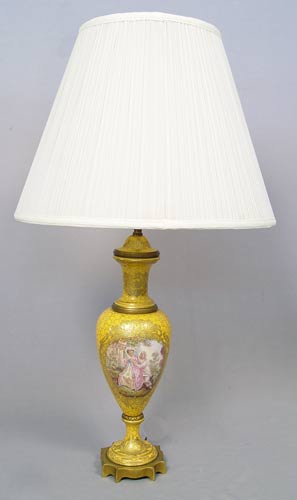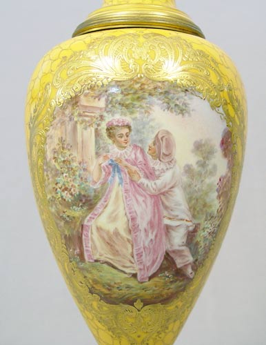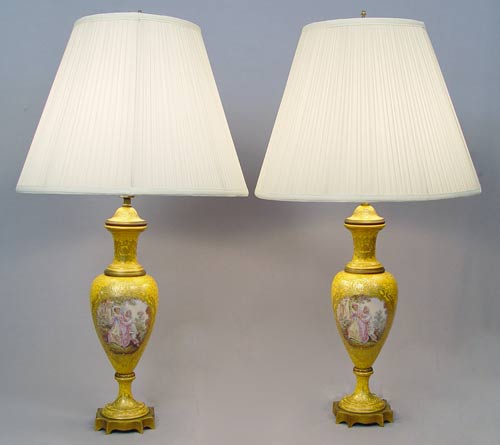 PAIR 18th C FRENCH PORCELAIN URNS / LAMPS: Hand painted. The porcelain is 16''h. Bears the mark of Rue de la Roquette 18th century. The lamps are converted from covered urns.