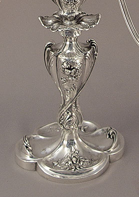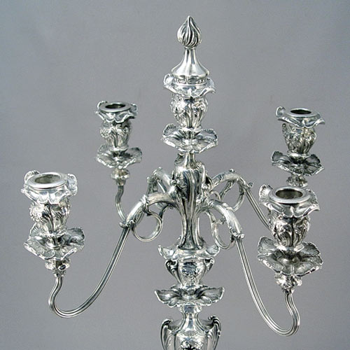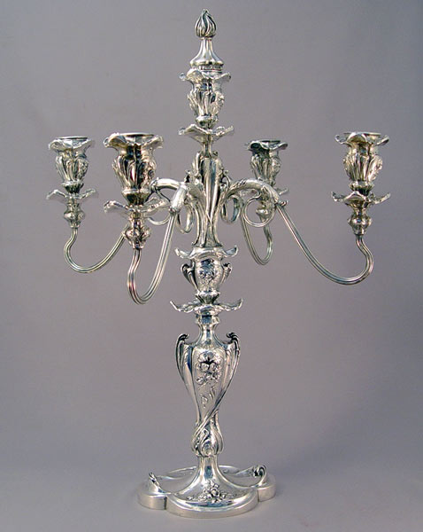 PAIRPOINT ART NOUVEAU SILVERPLATE CANDELABRUM: Ornate 5 light candlestick, Pairpoint #6157, 17 1/4''h. 15'' wide.