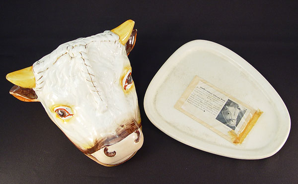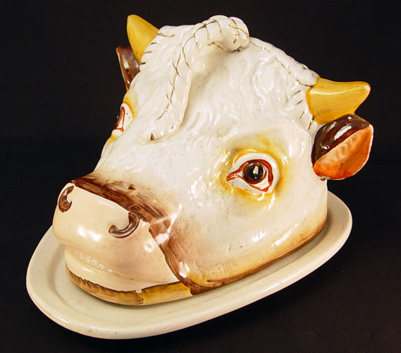 19th C STAFFORDSHIRE COW HEAD COVERED CHEESE DISH: Delightful cow head form with normal age discoloration, wear, and crazing. 7 1/2''h. x 7 1/2'' long.