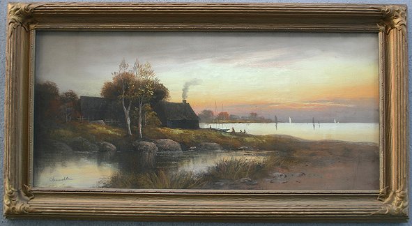 CHANDLER, William Henry, (American, 1854-1928): Landscape with figures, homes and sailboats on a lake, Pastel, sight size 13 1/2'' x 35 1/2'', signed, original period gilded frame with original glass and some over-paint, 21 1/2'' x 40 1/2''.