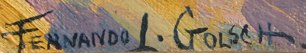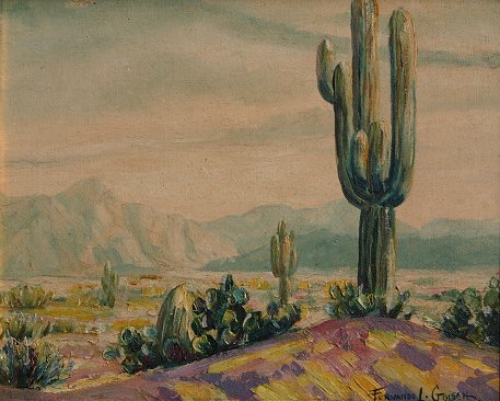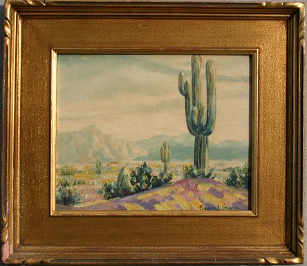 GOLSCH, Fernando, (American, 1874-1952): Desert Landscape with Saguaro Cactus, Oil/Board, 10 1/2'' x 10 1/2'', signed, signed and dedicated verso ''Christmas 1939'', period gilded frame, 15 1/2'' x 15 1/2''.