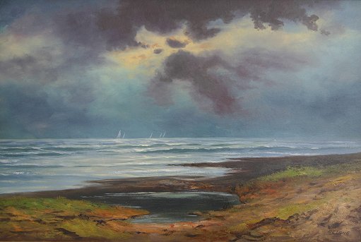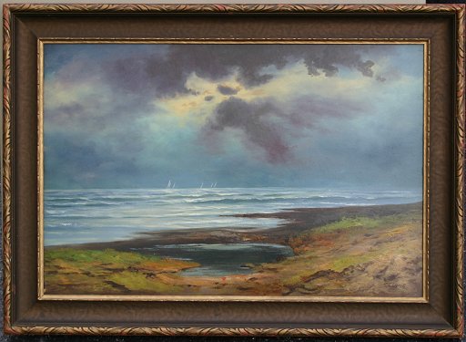 DELANE, Robert, (American, 19th C): Coastal Scene with Sailboats, Oil/board, 20'' x 30'', signed, original gilded and carved frame with wear, 25 1/2'' x 35 1/2''.