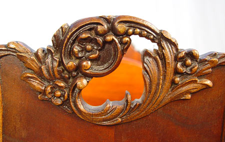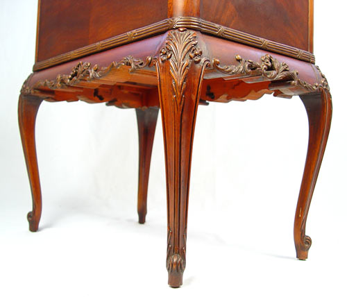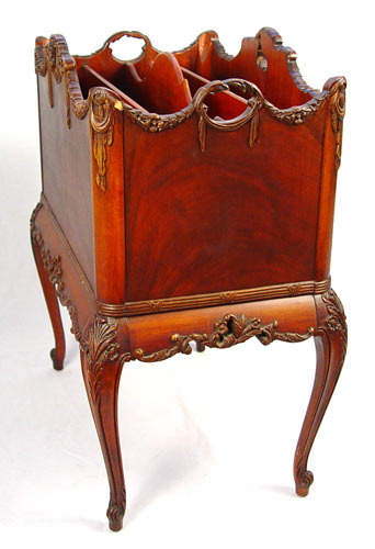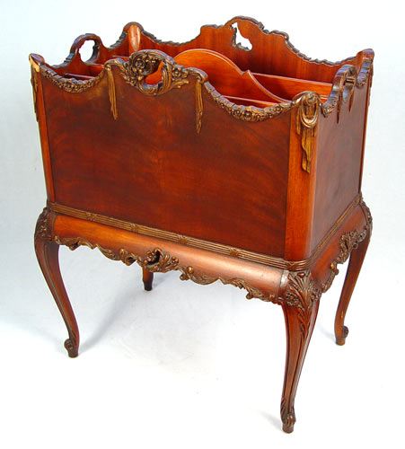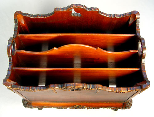 FRENCH STYLE MAHOGANY CANTERBURY: Carved mahogany with applied carving, richly grained matchbook veneer. Compartmented interior. Please note very small loss to the carving. 26''h. x 20'' x 13''.