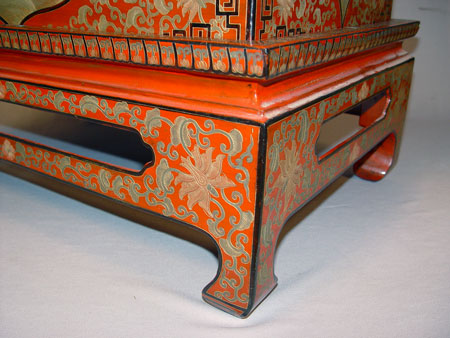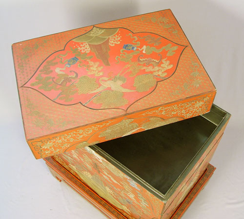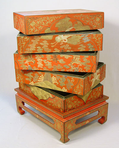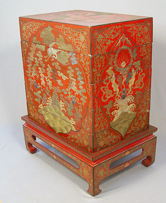 CHINESE RED LACQUER STACKING CABINET: 4 sections and top on the stand. Incised decoration. 33''h. x 23 1/2'' x 16''.