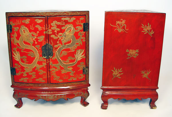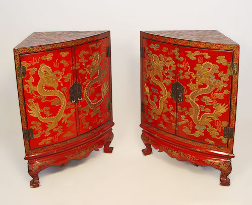 PAIR OF CHINESE RED LACQUER CORNER CUPBOARDS: Diminutive in size, 29 1/2''h. x 23 1/2'' across the front x 15'' deep. Double doors, black interior.