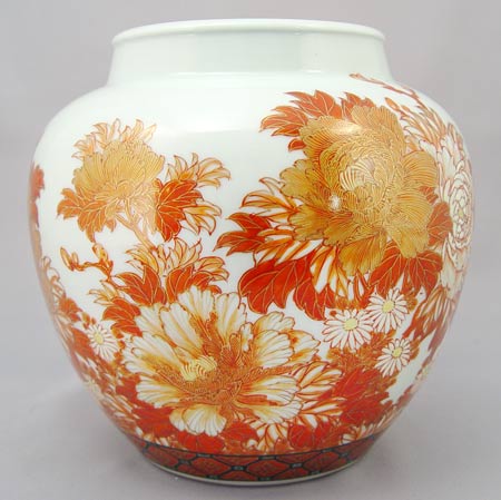 HAND PAINTED JAPANESE KUTANI VASE: 7 1/2'' high x 8'' wide overall. Signed in characters.