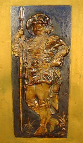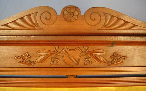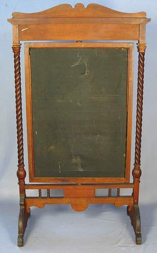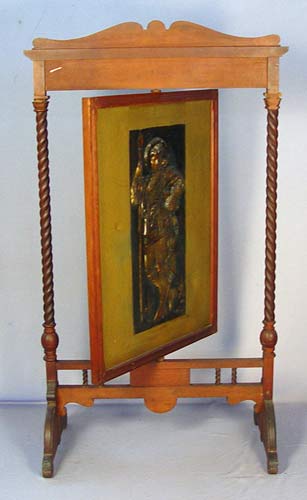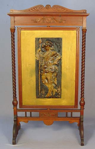 VICTORIAN CARVED FIRE SCREEN: Spiral carved stile posts joined by carved crest. Rotating tooled leather or canvas screen. Please call for condition. 49''h. x 26'' x 15 1/2''.